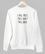 Valkoinen unisex collegepaita "I hug trees"
