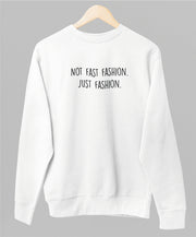 Valkoinen unisex collegepaita "Not fast fashion"